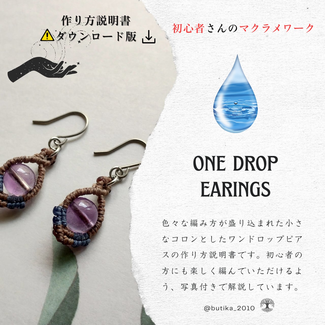 天然石をワックスコードで編み込むマクラメアクセサリー「ワンドロップピアス」の作り方説明書です。