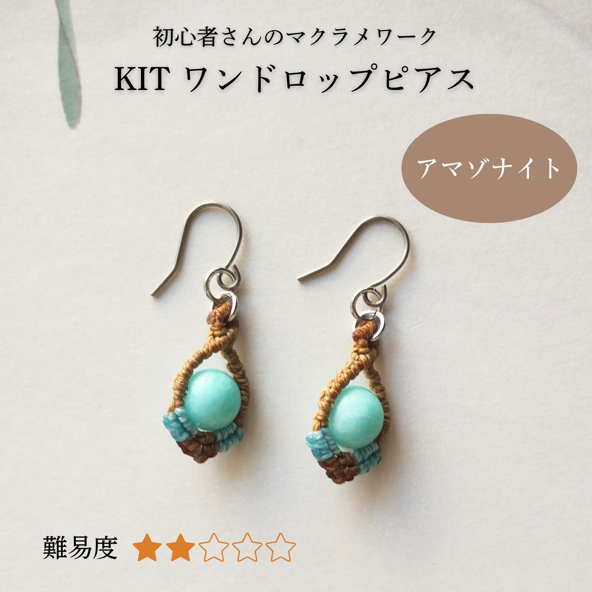 天然石をワックスコードで編み込むマクラメアクセサリー「ワンドロップピアス」の手作りキットです。