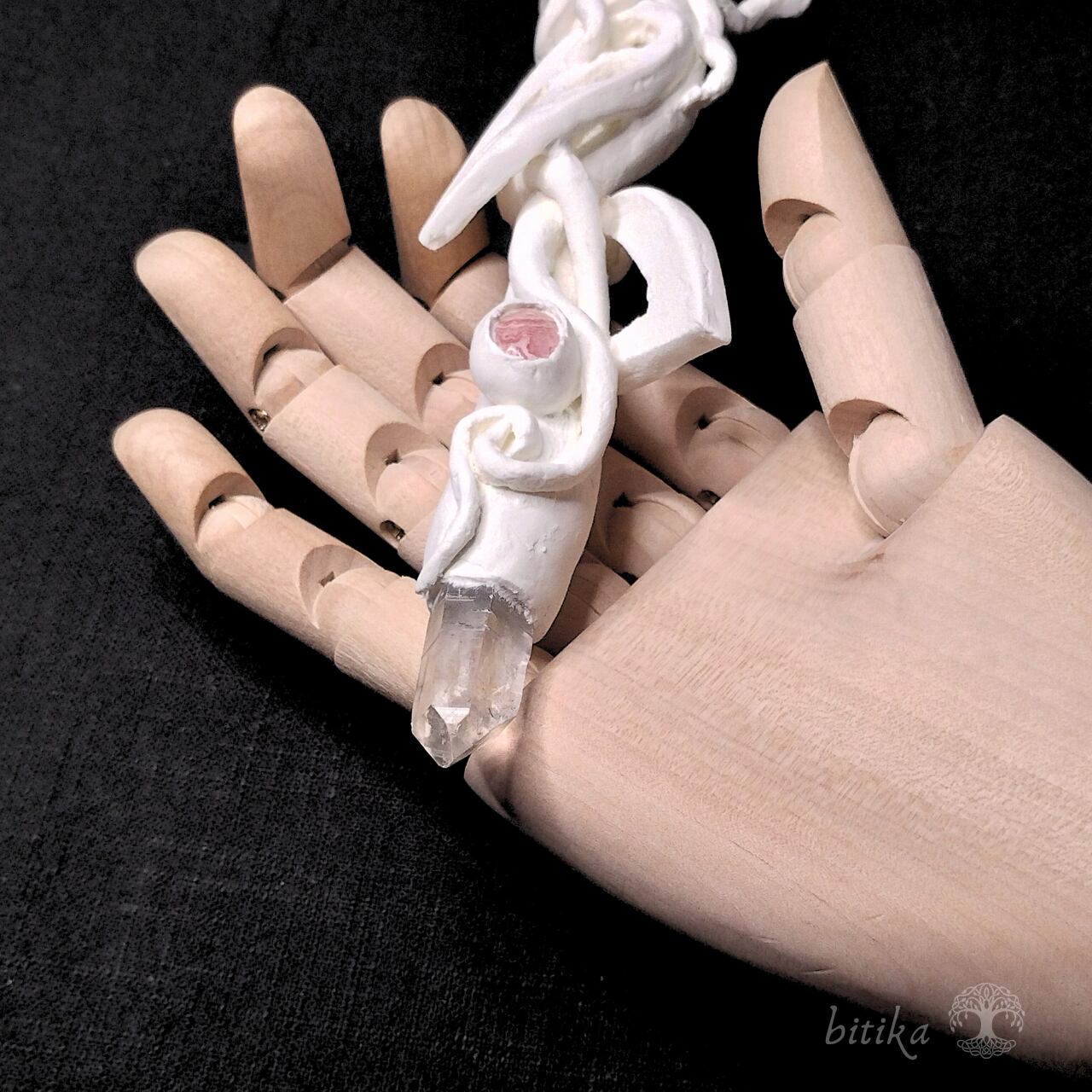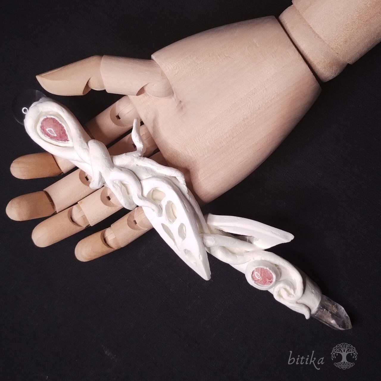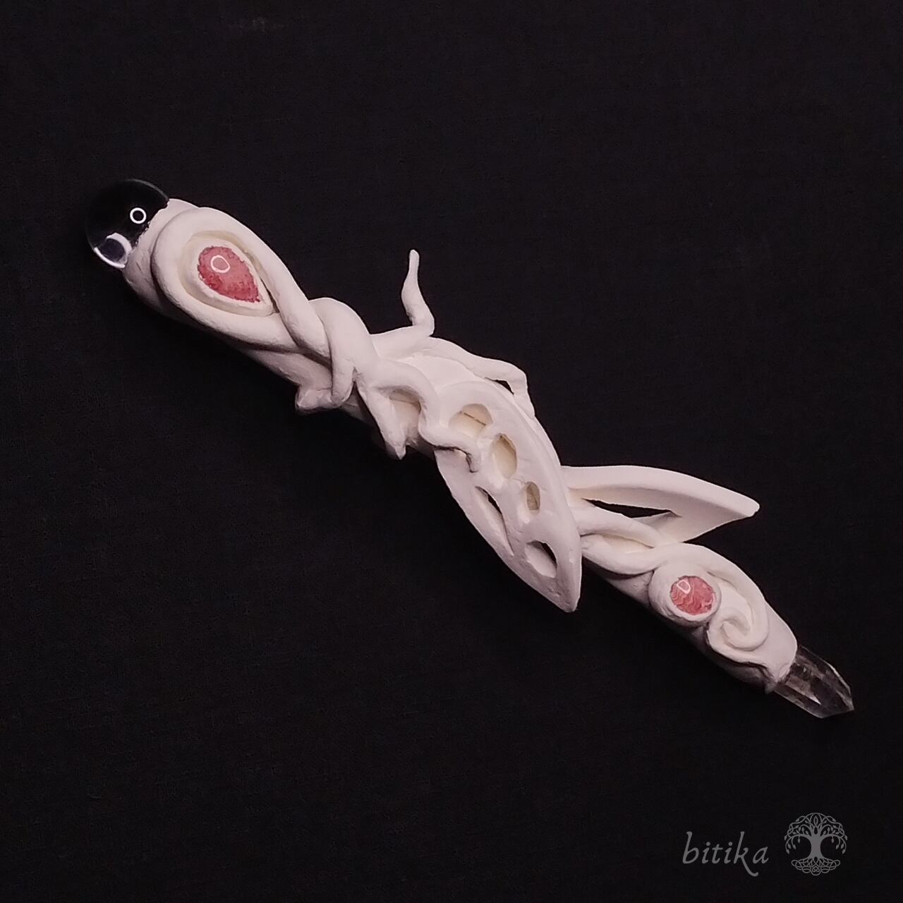 天然のロードクロサイト、水晶を使用しており、ひとつずつ異なる美しさが魅力です。天然石特有のクラックやインクルージョン(内包物)が、一つひとつの個性を際立たせています。杖の芯には桜の木を使用し、高品質の石粉粘土で製作した作品です。