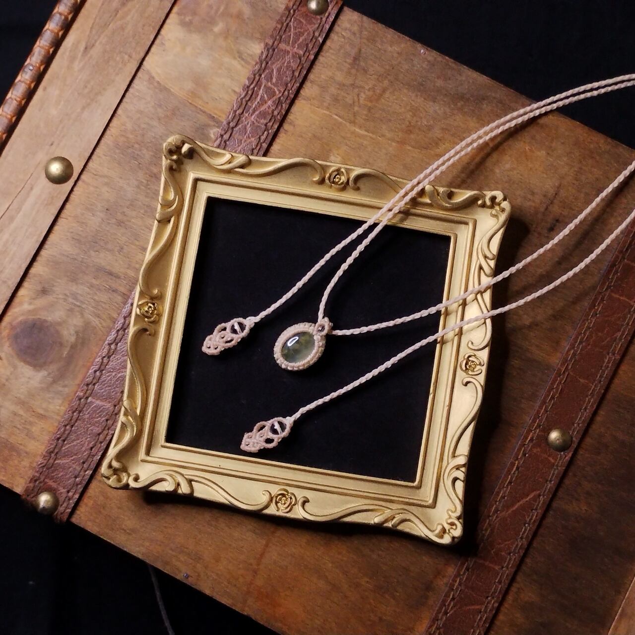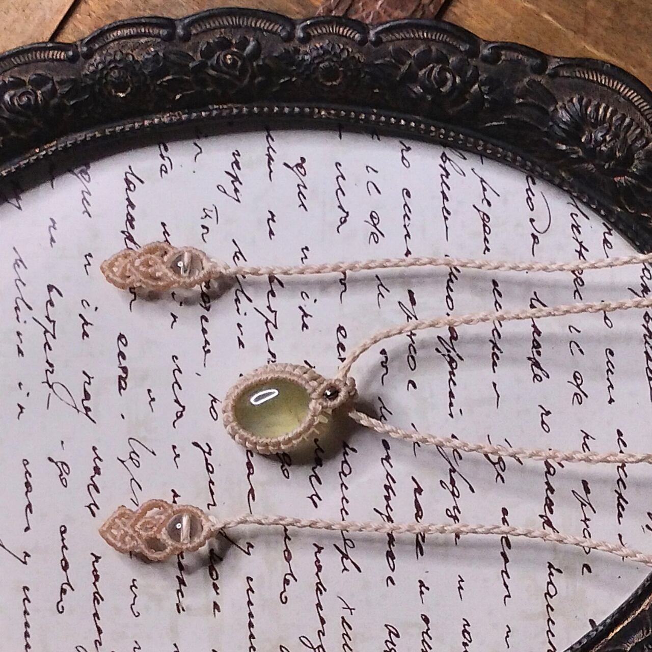 「必要のないものを手放すことを教えてくれる」の石言葉をもつマスカットのような優しいグリーンのプレナイトをベージュのポリエステルワックスコードで包み込むように編みました。天然石に見られる同じものがひとつとないクラックやインクルージョン(内包物)も個性として楽しんでいただけます。