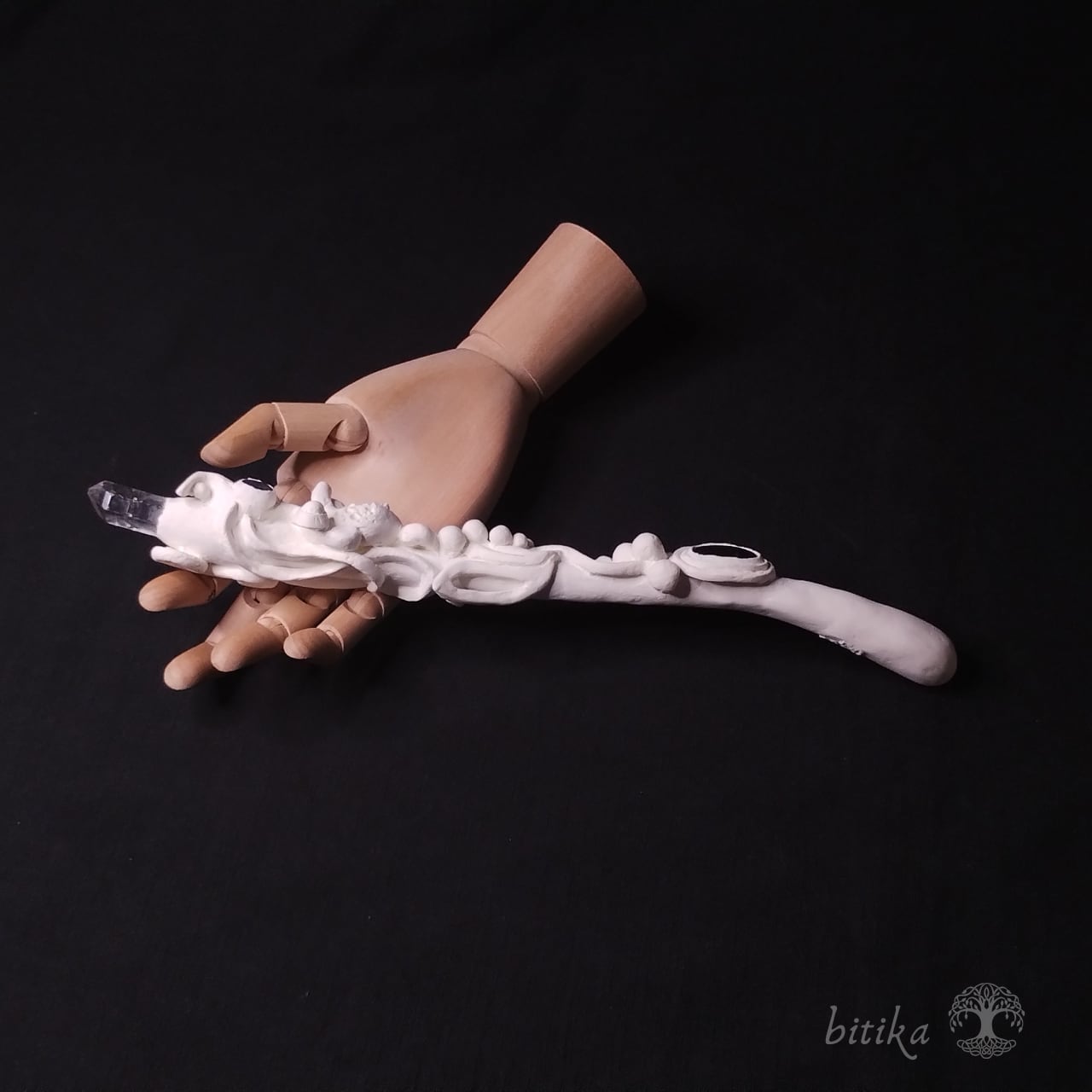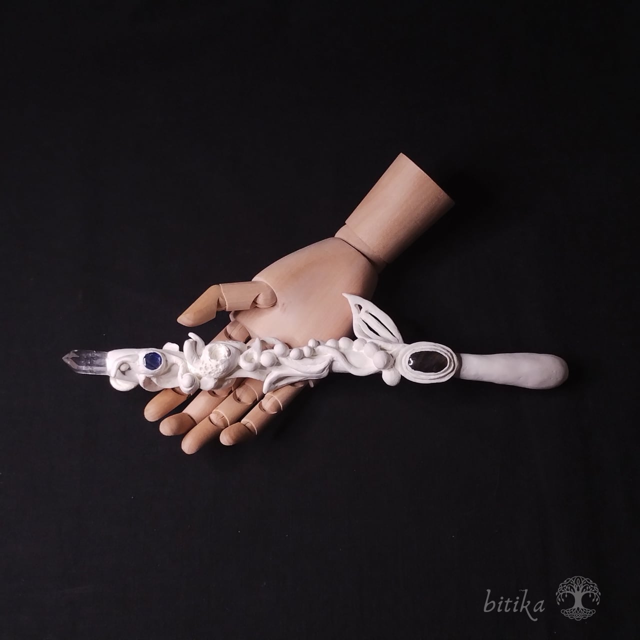 ラブラドライト、カイヤナイト、水晶を使用しており、ひとつずつ異なる美しさが魅力です。天然石特有のクラックやインクルージョン(内包物)が、一つひとつの個性を際立たせています。杖の芯にはオークを使用し、高品質の石粉粘土で製作した作品です。